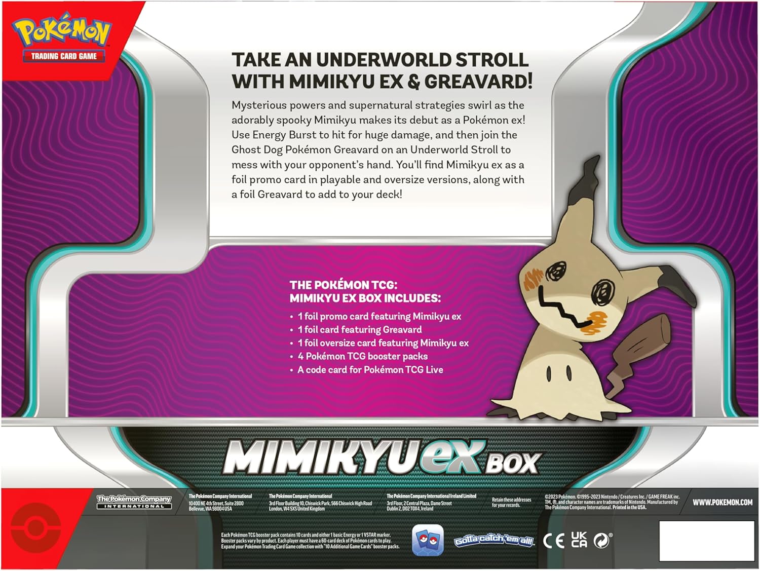 Mimikyu komt uit de schaduw met een grote dosis kracht! In de Mimikyu EX Box ontdek je dit mysterieuze Pokémon met een glanzende promokaart van Mimikyu EX en een extra Greavard-kaart. Mimikyu EX gebruikt zijn Ghost-type aanvallen om de tegenstander te verrassen, terwijl zijn EX-mechaniek zorgt voor extra kracht en strategie in elk gevecht.